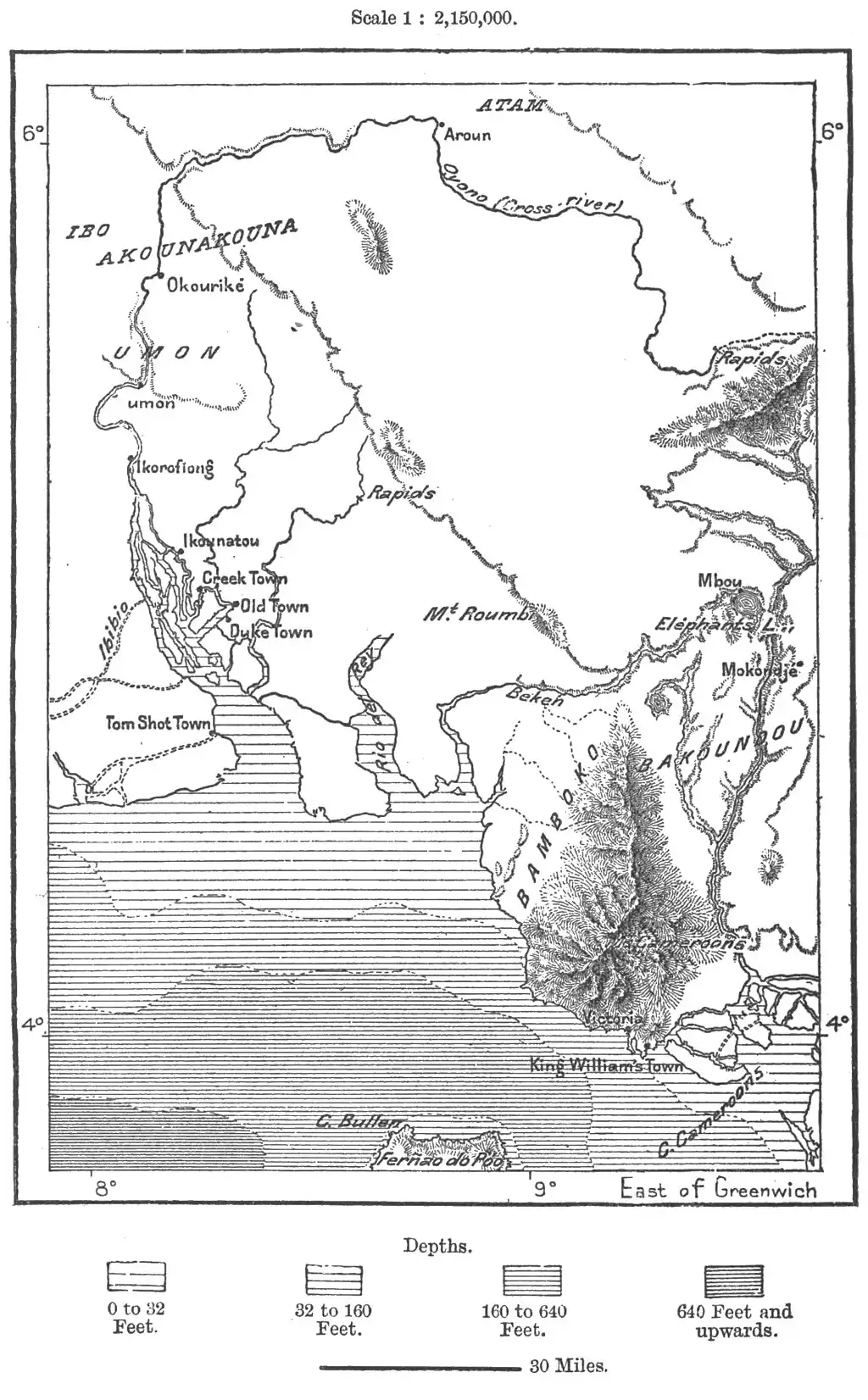 These Bonny men are the keenest traders on the coast, although closely pressed by their eastern neighbours, the Andoni, Quas, and Efiks of Old Calabar. These three tribes speak dialects of a radically distinct language, possibly related to others known only by name in the unexplored interior. The Efik, which alone has been seriously studied, seems to occupy an intermediate position between the Negro tongues in the north and west, and the great Bantu family, which begins in the Cameroon highlands, immediately east of the Rio del Rey.
