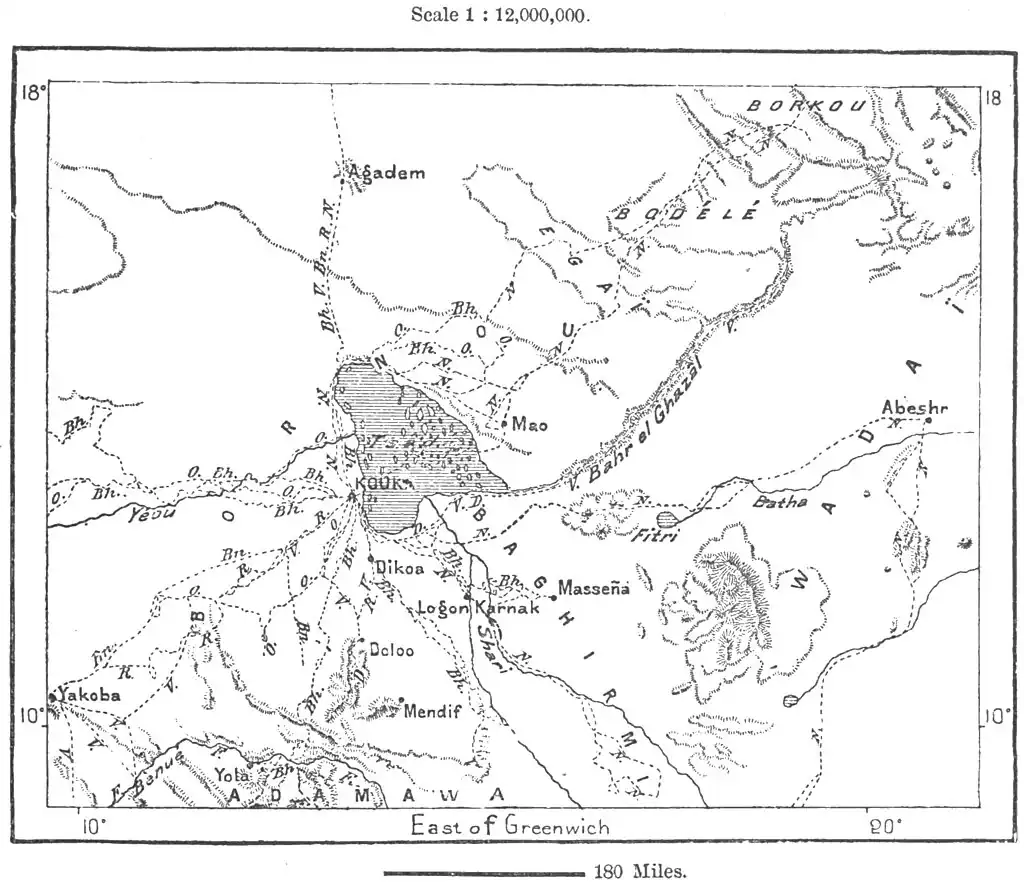 The Shari, which in the local idioms has the same meaning as Tsad, is one of the great rivers of Africa, the problem of whose source, however, is not yet completely solved. At the same time, Schweinfurth's suggestion that the Welle of the Monbottu and Niam-Niam regions is its upper course, is now rejected by most geographers, who regard the Welle as an affluent of the Congo. The farthest eastern headstreams of the Shari are probably still over 600 miles from