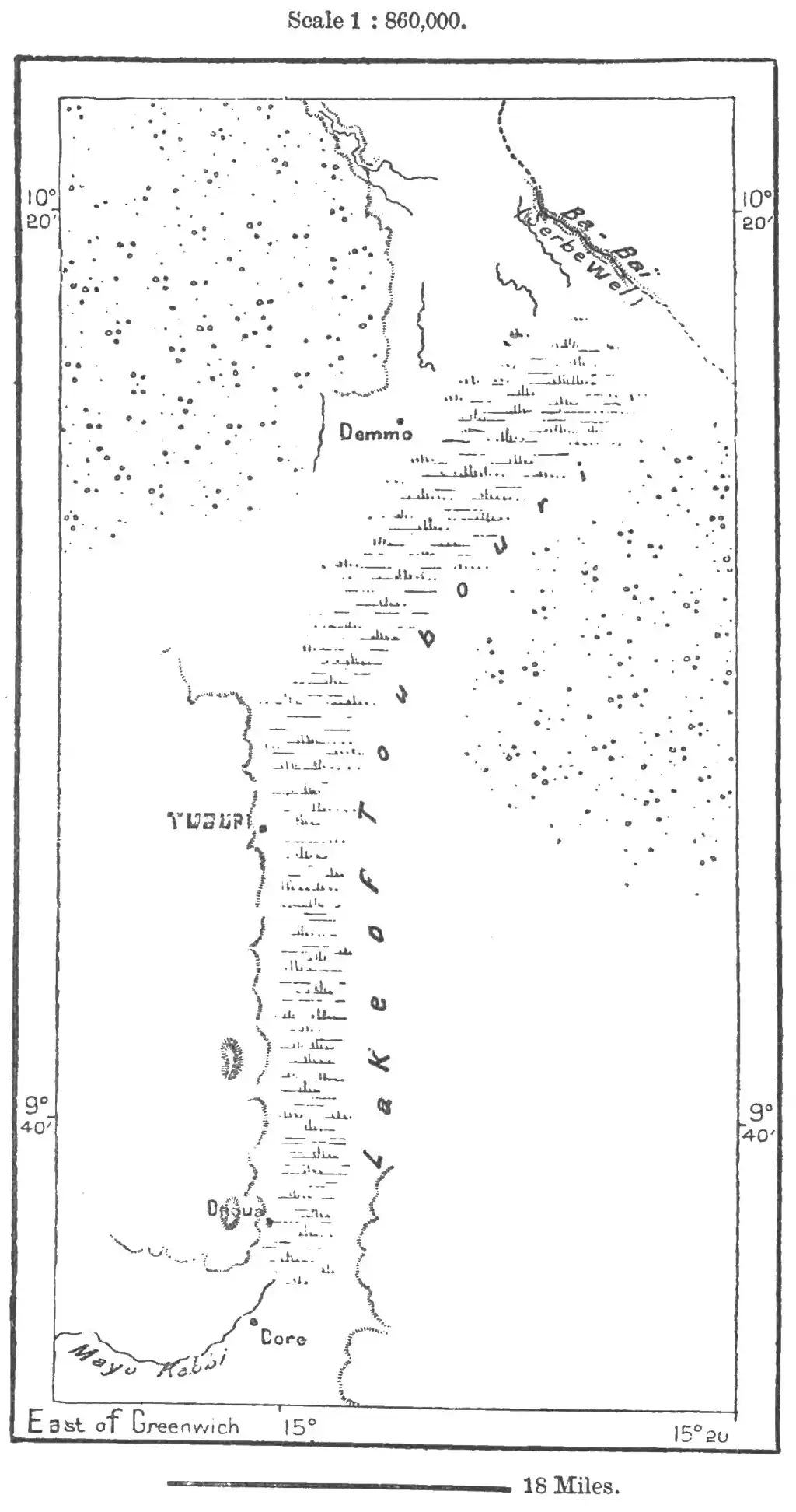 Unlike all other large closed basins, Tsad is a freshwater lake, a phenomenon all the more surprising that wells sunk in Kanem yield a brackish fluid, while several islands in the eastern archipelago contain saltpetre. Doubtless its main influent, the Shari, flows through a region extremely poor in salt; but if the lake