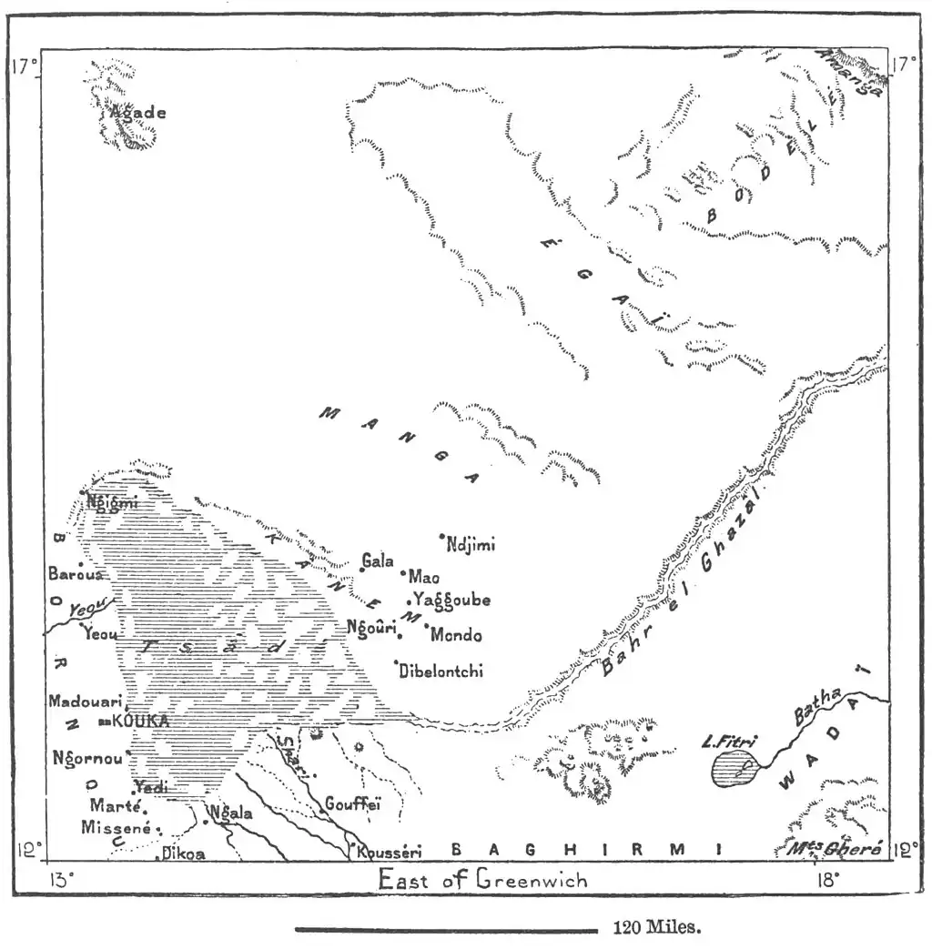 HE geographical centre of the African continent is not an Alpine range, as in Europe and Asia, but on the contrary a deep depression largely flooded by marsh waters, and in its relief inclining rather towards the Niger and the western regions. East and south this basin is encircled by mountains and uplands, north and west by disconnected hills and terraces, falling in the south-west to open, low-lying plains, through which the great lacustrine depression almost merges in the Benue hydrographic system. Thus the central region is almost everywhere easily accessible, and also contains a relatively dense population, estimated at certainly more than seven millions in a total area exceeding 280,000 square miles. Thanks to the fertility of the soil and its rich vegetation, the Tsad basin promises to become perhaps the most flourishing region in the whole of Africa.