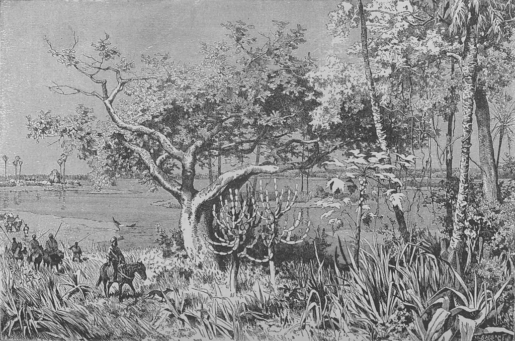 The coastline is clearly defined only at the northern extremity, where the Saharian sands drifting before the trade winds have been heaped up in dunes, whose base projects like a headland into the water. Almost everywhere else it seems impossible to say where the Fig. 170. — Lake of Tuburi. land ceases and the water begins. The south-east corner, and farther north the part near the Kanem coast, are occupied by groups of islands, covering, according to Nachtigal, one-third of the whole surface, and separated from each other by shallow or marshy straits. The southern archipelago of Karka is in fact a mere assemblage of eminences dotted over a morass, which if drained would present an appearance analogous to that of the neighbouring land of Kanem, where green hills and leafy thickets alternate with treeless spaces.