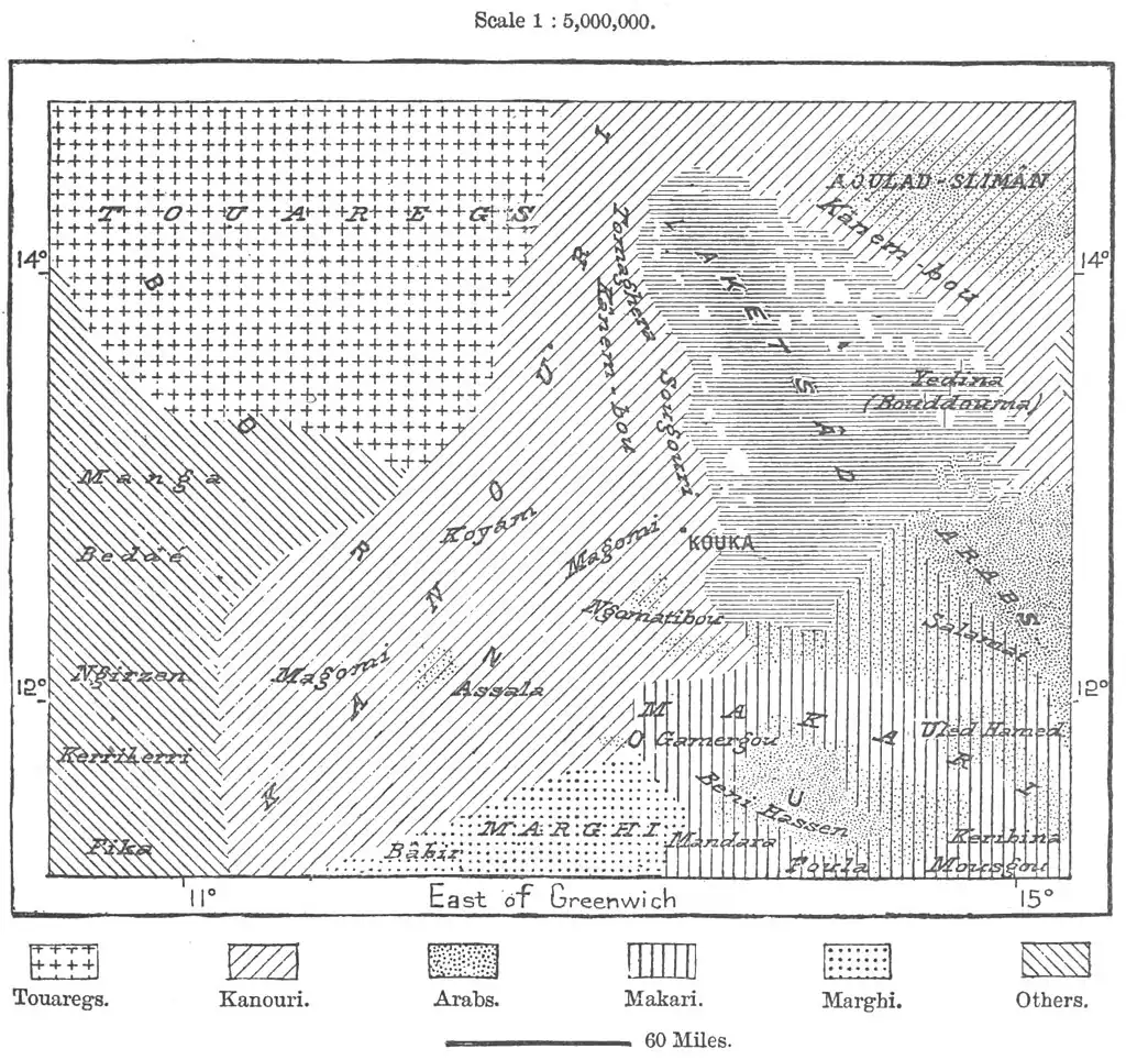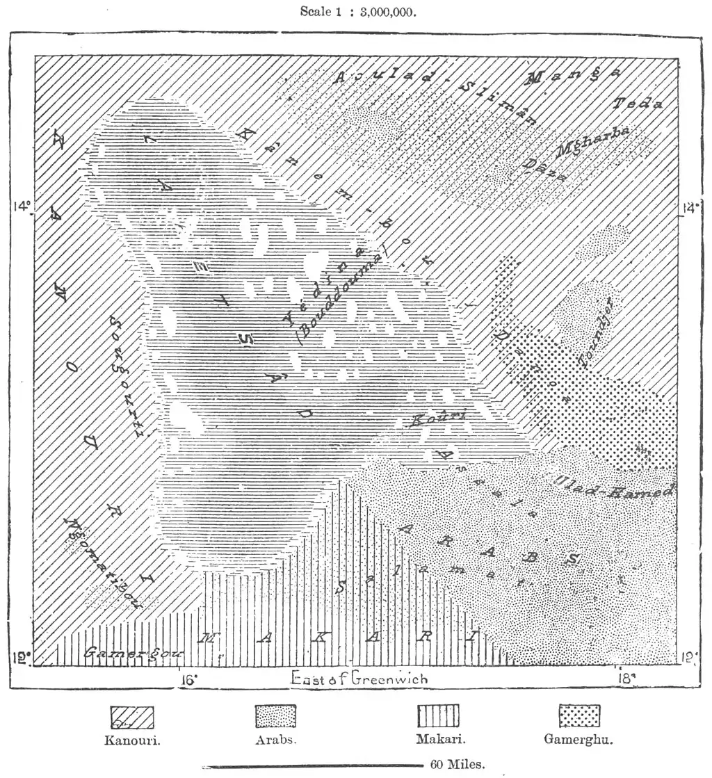 The kingdom of Kanem was for five hundred years, from the beginning of the tenth century, the hotbed of the Mussulman propaganda, and the most powerful kingdom in Central Africa. Then about 1500 the centre of political influence was displaced towards Bornu under the influence of the Bulala invaders from the east, a people akin to the Kanuri. Since that time Kanem has never recovered its independence, passing successively from the Bulalas and Kanuris to the Dazas and its present Arab rulers, the Aulad-Sliman, who are regarded as the masters of the country, although forming a mere fraction of the population, and in 1871 mustering not more than one thousand armed men. Yet this handful of warlike clansmen, often at feud among themselves ever the distribution of the plunder, contrive to keep in a state of terror all the populations comprised between Bornu, Air, and Wadai. By the Dazas and others bordering on North Sudan they are called Minnemime or "Devourers," a name said to be given to them on account of their gluttony, but which may be accepted in a figurative sense; for they have verily devoured the land on which they have pitched their tents, and in many places they have passed like a whirlwind, sweeping before them the inhabitants with their flocks and all their substance.