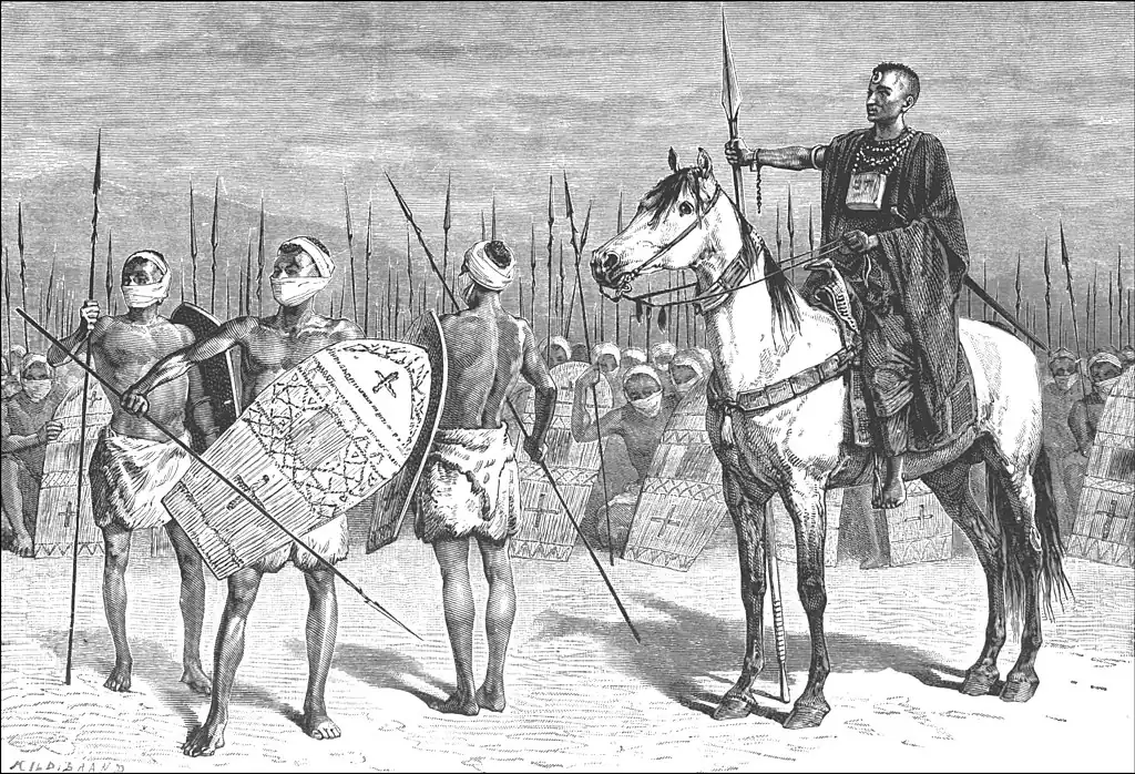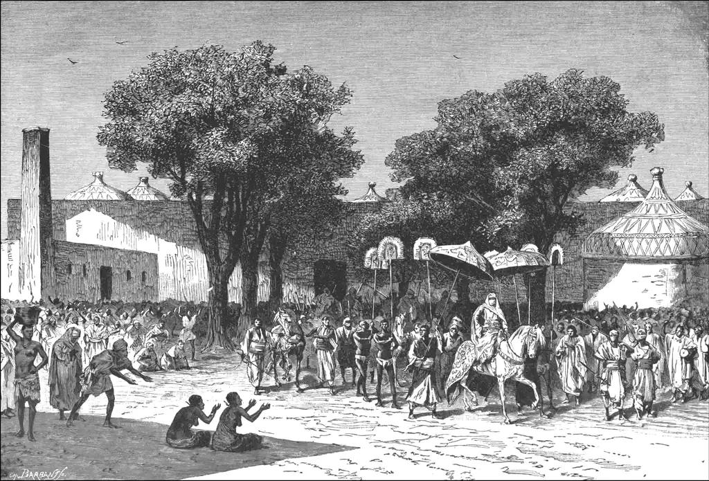 Like nearly all the central African governments, that of Baghirmi knows no law except the ruler's whim, no limit except the power of rival neighbours. But to guard against dangerous enemies in his own household, the sultan, on ascending the throne, causes each of his brothers to be blinded of one eye, custom requiring the reigning sovereign to be free from any physical defect. His despotic powers are enforced by his numerous eunuchs and other functionaries, who impose the taxes and plunder the people at pleasure. The subject must approach his master in very humble attitude. On entering the sultan's palace all bare their breasts, fall on their knees, and bend forward with clasped hands. This rule of etiquette is dispensed with only in favour of the musicians, who are of royal blood, and of some Sokoro chiefs, whose warlike deeds have placed them above the common law.