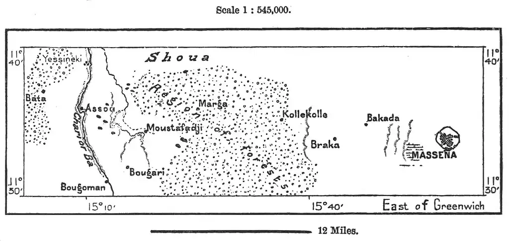 Masseña (Massenia), city of the "Tamarind-tree," capital of Baghirmi, was founded over three centuries ago in the vast plain of the Lower Shari, about 12 miles north of Batchikam. Within the walls is comprised a considerable extent of cultivated land, market-places, and even a temporary lake, presenting somewhat the same aspect as that of Kano, and rendering the city very insalubrious. Massena, which was captured by the Sultan of Wadai in 1871, is the largest town in the kingdom, and before the siege had a population of at least twenty thousand. According to Nachtigal, Bugoman, on the left bank of the Shari, is only one-fourth as large, but occupies one of the most convenient points for caravans to cross the river. Together with its neighbour, Kokorotché, it supplies nearly all the corn required by the markets of the capital.