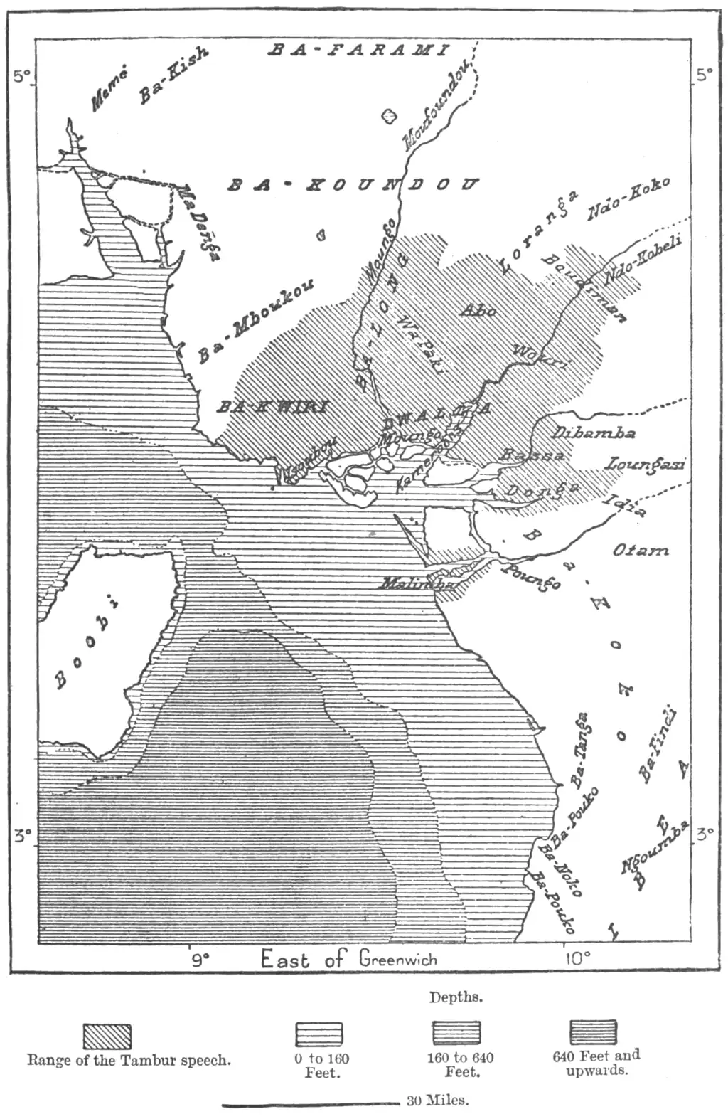 bight. But it should be removed from modern geographical nomenclature, having apparently originated through a clerical error for Mafra, the name of a mountain inscribed in the early maps on the exact site of the Ba-Farami range, so that the resemblance between these two terms may not be altogether fortuitous. Near the mouth of the Moanya have been established three factories trading with the neighbouring "Little," or Northern Ba-Tangas. Higher up the centre of traffic is at the large village of Javanja, where the less civilised Ba-Kokos of the interior come in contact with the Ba-Tangas. Under the common designation of "Great Ba-Tangas" are comprised two distinct tribes, the Ba-Pukos north of THE CAMER00N3. 383 Elephant Mountain, and the Ba-Xokos in the Criby district and farther south to the mouth of the Rio del Campo, The long-standing blood-feud between these two tribes was recently brought to an end by the intervention of the European traders. This group of tribes are the most skilful boat-builders in the whole of Africa. They launch on the Moanya large war galleys impelled by about sixteen rowers, with a speed unrivalled by any European craft. Amongst the Southern or Great Ba-Tongas these boats have been replaced by skiffs of amazingly light build, about 7 feet long, 12 inches broad, 6 inches deep, weighing but from 10 to 20 pounds, with which they skim over the crests of the waves, fearlessly crossing the dangerous surf -beaten bars which Europeans scarcely venture to approach in open boats. The factories in the Great Ba-Tanga territory are at present the most important depots for the ivory trade, brought from the interior by the Ibeas (Ma- Bea), or " Brush People," who speak a very different idiom from that of the coast tribes. Like the Fans farther south, these Ibeas are constantly moving seawards, and have already reached the coast at two points north and south of the Lobe River. Beyond the coast plateaux and the hypothetical Sierra Guerreira range, east of their domain, lie the regions stretching towards the Upper IJ-Banghi and Shari basins, where is found the Liba, or " Lake," frequently mentioned by the natives. But whether it is really a great sheet of water, or a large river, perhaps the U-Banghi itself, is still unknown. Of all the unexplored Central African regions these have hitherto best preserved their secret.