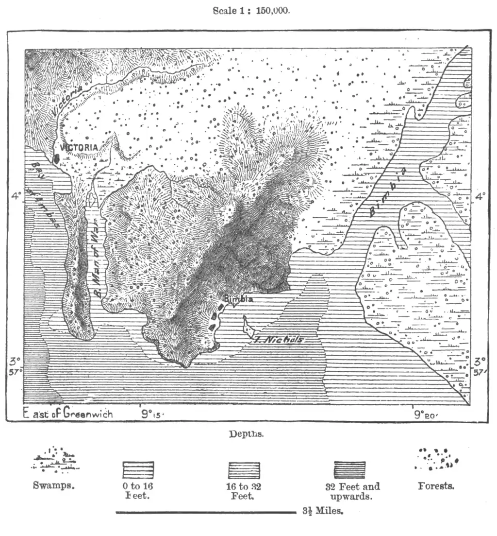 Victoria, the chief station in the Caraeroons, was founded in 1858 by some Baptist missionaries who had been expelled from Fernando-Po by an intolerant Spanish governor. The whole district was acquired by them for a few casks of salt meat and biscuits, and one of the most picturesque sites in the world selected for the station, at the foot of the forest- clad mountain and on the shores of an island- studded inlet. The two verdant islands of Amhas {Ambozes, Amboise) and MondoU stand out against the hazy background of Fernando-Po with its cloud- capped cone, while the beach-, fringed with dense vegetation, stretches away to the south and west.