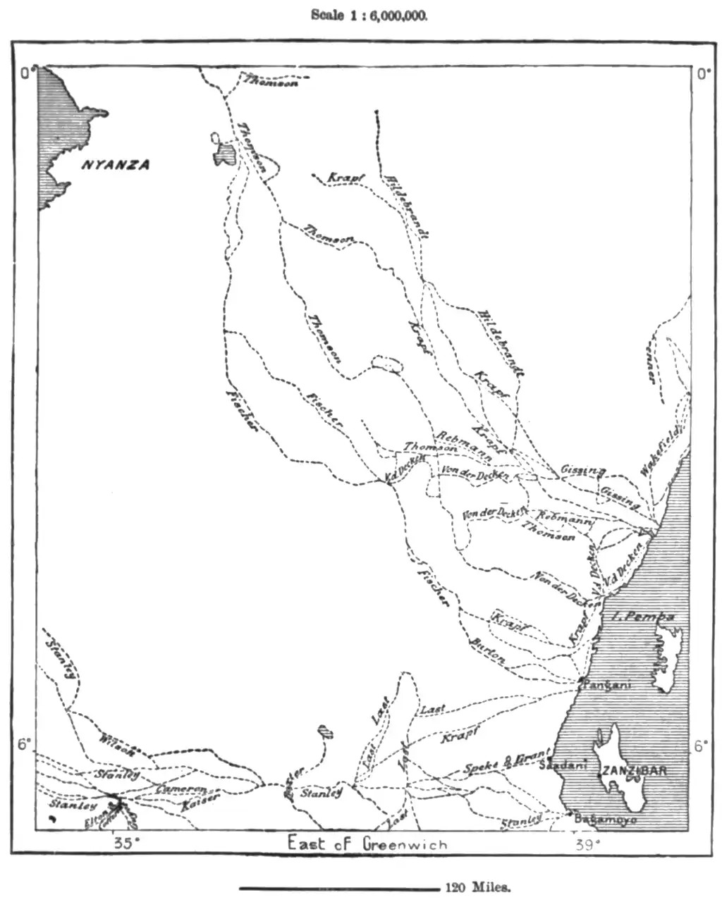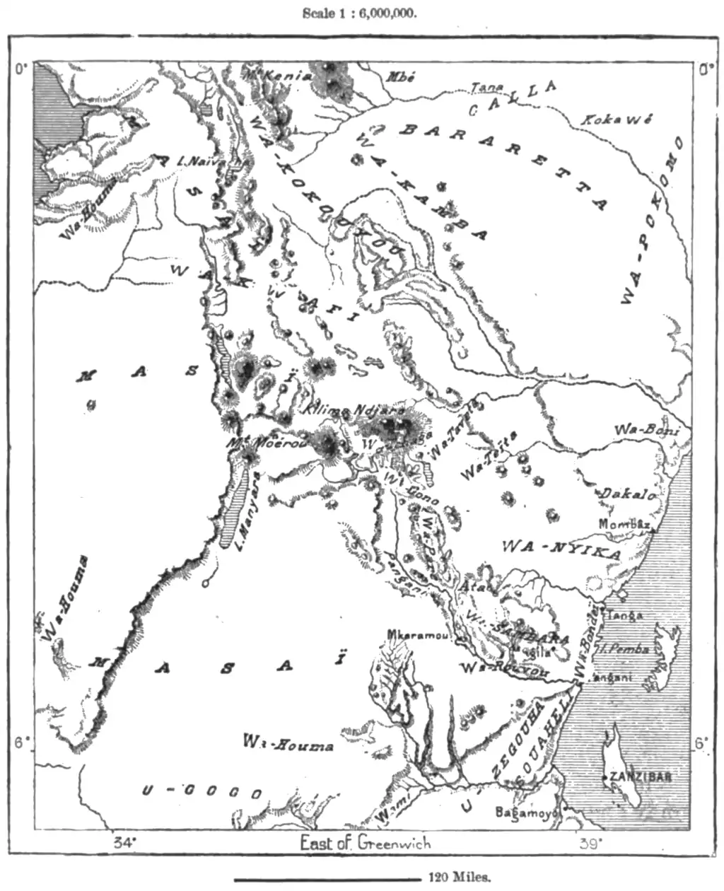 HE maritime region which stretches-north of the territory facing Zanzibar, and which is bounded on one side by the Pangani, on the other by the Tana, holds a political position analogous to that of the southern lands. Here also the narrow zone of coastlands was recently placed under the authority, or at least the suzerainty, of the Sultan of Zanzibar, while the seaports are drawn henceforth within the sphere of foreign trade. The inland tribes also, although really independent, have in the same way been assigned by international treaty to European influences. The Germans are the future masters in the Pangani basin, while the northern area of drainage has become a British possession.