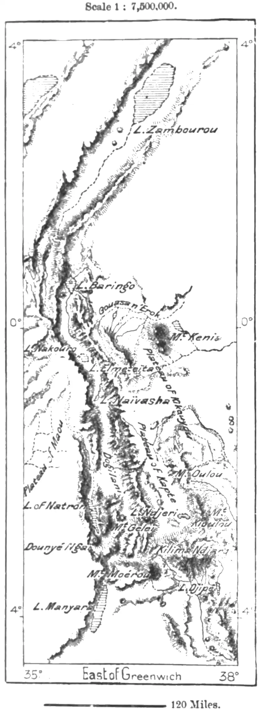 outer scarp of a plateau, runs with great regularity in the direction from south to north. This long line of cliffs, rising abruptly above the plain, very probably represents the ancient shore-line of a now vanished inland sea, of which nothing remains except a system of stagnant waters, lakes, and saline wastes, covering a large space at the foot of the escarpments. The volcanic cones occurring at intervals along the edge of the plateau are the flues of the underground fires formerly fed by the chemical ingredients which were elaborated in the depths below the bed of this extensive lacustrine basin. The still flooded depressions, mainly disposed in the same direction from north to south, stand far below the level of the rim of the tableland, which has a mean elevation of about 6,500 feet above the sea, whereas one of these depressions rises scarcely more than 2,000 feet above that level. A sort of trough or deep lacustrine cavity, with no present outflow, thus separates the elevated western plateau from the raised platform on which stand the great igneous masses of Kilima-Njaro, Kenia, and their associates.