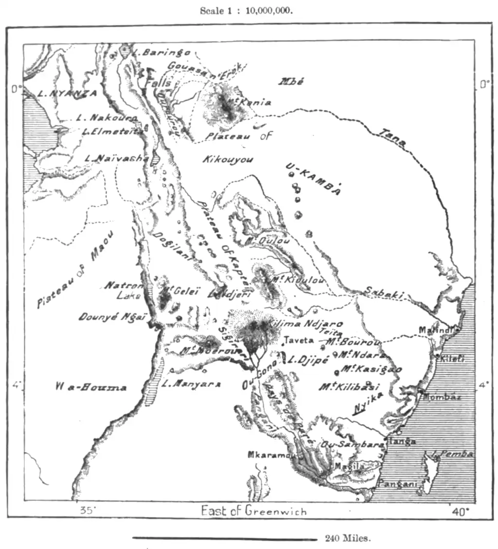 These uplands are followed towards the north-west by the Paré range, beyond which the horizon is broken by the Ugono ridge, dominating on the west the charming Lake Jipé, and north of which towers the imposing mass of the giant of African mountains. On the continually ascending plains, which extend from the coast at Mombaz towards Kilima-Njaro, the surface is strewn with granite eminences from 4,000 to 5,000 feet, which in several places are disposed in the form of regular ranges. Such peaks as Kilibasi, or Kilimabasi, that is, the "Solitary Mountain," the truncated cone of Kasigao, and Maungu with its half ruined crater, stand out in complete isolation like reefs or rocky islets in the midst of the sea. But Mount Ndara, called also Kilima-Kiburu, that is, the "Great Mountain," lying due west of Maungu, is flanked by a number of less elevated crests, giving to the whole group the aspect of a short Ibu continuous chain. Still farther west the plain stretching away towards Kilima-Njaro is dominated by a somewhat similar but more extensive group bearing the collective name of the Bura Mountains. But on every side — north, south, east, and west —