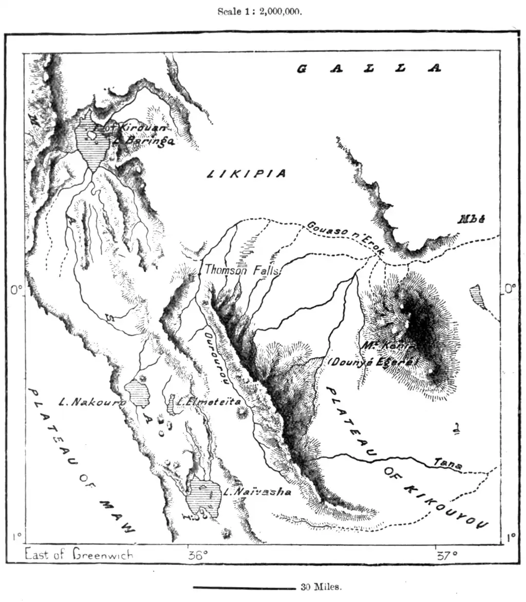 The existence of Eenia was unknown in Europe before the year 1849, when it was first mentioned by the missionary, Krapf ; but no traveller has yet succeeded in climbing the slopes of this volcano. Even Thomson, who approached nearest to it, surveyed only its eastern face, and that at some distance. I^ike Kilima- Njaro, Kenia discharges much more water by its southern valleys than on the other slopes of its vast periphery.