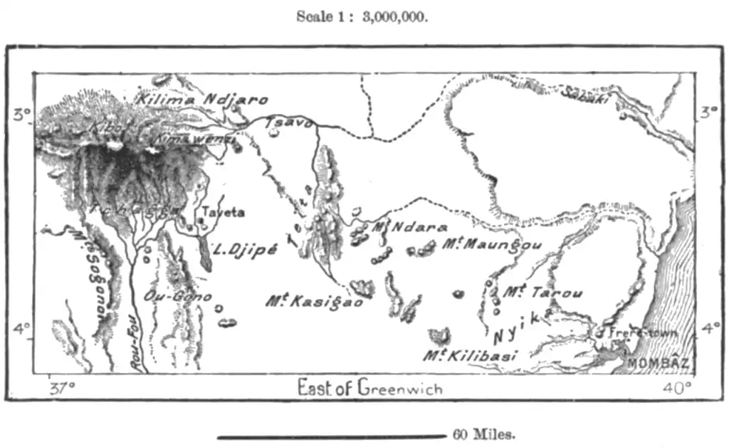either of its superficial area or of its population. It may, however, be stated in a general way that the rectangular region comprised between the Indian Ocean, the eastern edge of the plateaux sloping westwards towards Lake Nyanza, and two parallel lines, one passing to the north of Mount Kilima-Njaro and Usambara, the other drawn from Mouut Kenia to the Tana estuary, presents an area of about 55,000 square miles, According to the reports of Krapf, Fischer, Thomson, and Johnston, the population of this territory may be roughly estimated at nearly two millions.