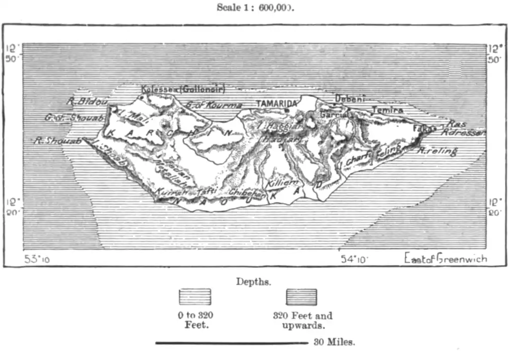 F all insular regions in the Pacific Ocean, Sokotra, or Socotra may with the greatest confidence be regarded as a simple geographical dependence of the African mainland. Although separated from Cape Guardafui by a channel 150 miles broad, with intervening spaces fully 3,000 feet deep, the disposition of the island, with its main axis disposed in a line with the extreme point of Somaliland, together with a continuous row of reefs and islets stretching right across the channel, clearly shows that Sukotra is nothing more than a detached fragment of Africa.