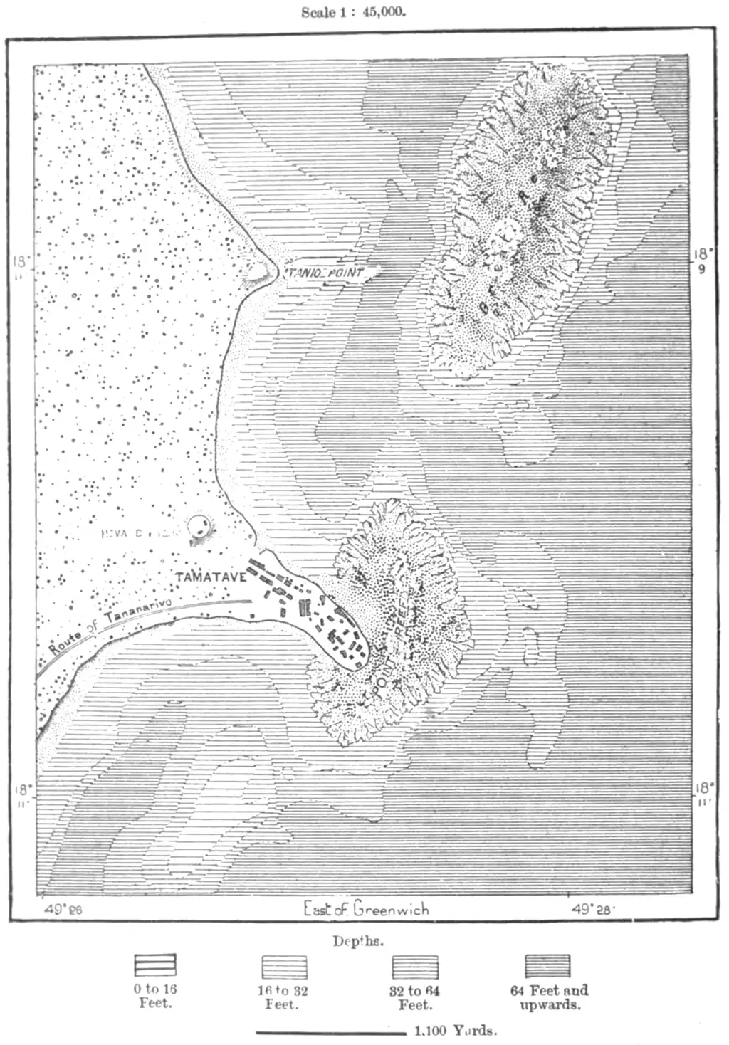 lies nearest to the capital. Hence travellers bound for Tananarivo follow the coast from Tamatave to Andovoranto, and then strike inland from a neighbouring estuary, whence they soon reach the escarpments of the central plateau. This would consequently be an excellent site for a great commercial or naval station, but for the dangerous character of the neighbouring coastlands and the difficult approaches, which render it quite inaccessible to vessels of heavy draught. Yet a few Creole traders have already settled at Andovoranto, defying the pestiferous atmosphere of the surrounding swamps and stagnant waters.
