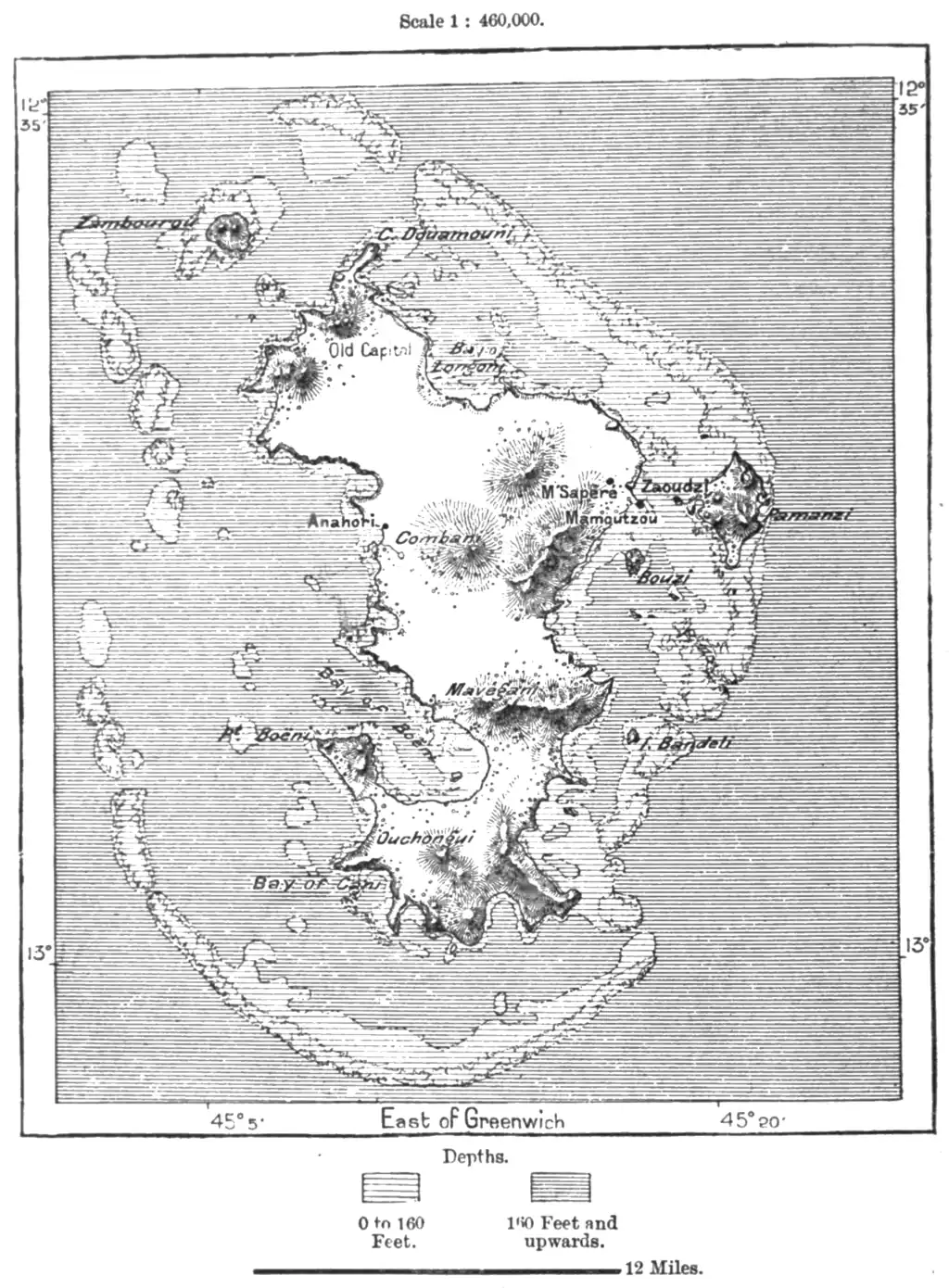 The Comoro or Korar group, a nume also at one time extended to Madagascar, has been known to the Arab navigators at least since the tenth century, and was also formerly visited by the Persians of Shiraz, who traded with Magdoshu and Kiloa on the African seaboard. During the eailydaysof Portuguese enterprise, mariners from Lisbon called at Great Comoro. But the first permanent settlers, mostly runaway slaves, came from Madagascar and East Africa, and even from Arabia, forming in the archipelago a mongrel race, which presents all the transi- tions from the almost pure Semite to the Malagasy and Bantu types. A few Banyan traders have also been attracted from Bombay ; but the bulk of the population, collectively called Ant'Aloch, represents a mixture of diverse African, Arab and Malagasy elements. The Ant'Aloch islanders are mostly tall, with a yellowish complexion, thick but not pouting lips, high but narrow brow. The hair, naturally crisp or kinky, is usually shaven in the Mussulman fashion ; the women also blacken their teeth with betel-chewing, while many are tattooed and wear a metal button or flower on the nostril in the Hindu style. At Mayotte, where the Malagasy element prevails, the people are of darker colour, but in the other islands of more Semitic appearance. The natives of Great Comoro are an exceptionally tall and stalwart race, and travellers speak with admiration of these men, whose robust constitution and freedom from disease are attributed both to their cleanly habits and to the salubrity of the climate. The Ant'Aloches and dominant Mahorri, or "Moors," are all Mohammedans of mixed descent, who endeavour in all things to conform to the usages and institutions of their Arab teachers. The Sultans draw up their decrees in Arbbic although the current speech is a variety of Ki-Swaheli mixed with a few Malagasy and numerous South African elements, introduced by Makua and other slaves from the mainland. These slaves still constitute nearly half of the population, although the Sultans have undertaken to abolish slavery. The French island of Mayotte (Maute) is three times smaller, but commercially more important, than Great Comoro. The roadstead, protected eastwards by the islet of Pamanzi, is very deep and spacious enough to accommodate whole fleets. But although it enjoys the advantage of free trade, Mayotte is too small to attract much traftic, and has failed to realise the hopes of those who expected it would become a great mart for Madagascar and the mainland. Besides cocoanuts it yields coffee, cotton and especially vanilla, and the planters, chiefly from Mauritius and Reunion, have recently taken to the cultivation of sugar and distillation of rum. The administration, at first established at Zaudzi, at the western extremity of Pamanzi, has been transferred to Mamutzu or Shoa, facing it on the east side of Mayotte. But the largest place in the island is JifSnpere, close to the hill of like name over a mile farther inland. Since the French annexation the popiUation of Mayotte has increased fourfold, having risen from three thousand three hundred in 1843 to about fourteen thousand in 1888. Anjuan {Johanna, Nsuani) has always enjoyed a considerable trade as an intermediate station between the Cape and India. The British cruisers employed in the suppression of the slave trade maintained a provision and coaling station on this island, which is the most fertile of the Comoro group, yielding good crops, especially of sugar. Its Arab sultan resides at Msamudu, called also Anjuan, a sort of mediæval fortified town situated on the north-west side, and with a population of nearly four thousand.