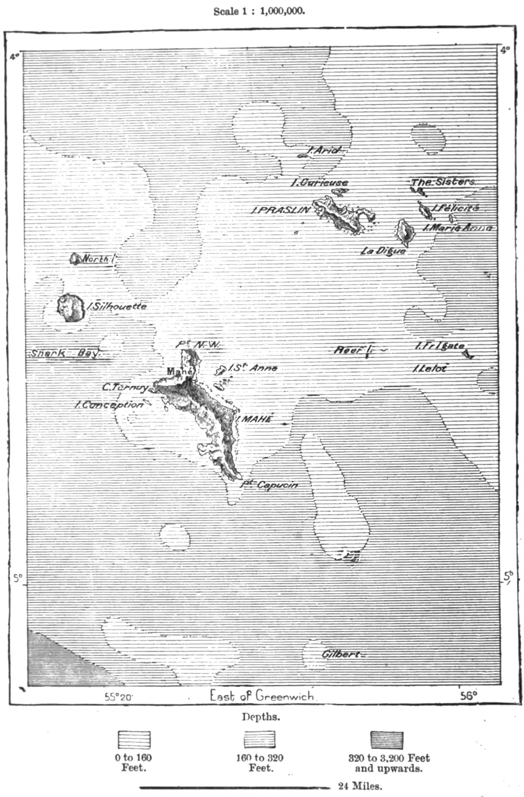 Great Comoro (Ngaziya), although the largest and most populous member of the archipelago, is little cultivated and seldom visited by traders, owing to the absence of water and good havens. The sultan resides at Muroni, a small place situated on a creek on the south west coast. THE SEYCHELLES. 471 A geographical dependence of the Comoros are the reefs running north-east of Mayotte parallel with Madagascar, and terminating in the little group of uninhahited Gtorieme islets. About 120 miles farther north lies the coralline group of the Cosmokdos, also uninhabited, but claimed by the English as a dej>endency of Mauritius. Under the same latitude, but seventy miles to the west, is the larger island of Aldabra, a true atoll divided into several secondary islets and reefs. Here a few Norwegian families, chiefly from Bergen, founded a fishing station in 1879. Aldabra is visited by gigantic turtles and myriads of aquatic birds. All these islets lying east and north of the Comoros have a total extent of little over sixty square miles. IV. — The Amirantes and Seychelles. North of Madagascar the main insular axis is continued over 120 miles sea- wards by a submarine plateau about 900 fathoms deep. Above this plateau rise a few scattered islets separated by a profound trough from the two archipelagoes of the Amirantes and Seychelles. All these insular groups belong politically to Great Britain as dependencies of Mauritius. Farquhnr, the nearest to Madagascar, is not quite uninhabited, a few fishermen mostly from the Mascarenhas having established themselves on the western island of Joao de Nova. Farther north follow some dangerous reefs, and beyond them the numerous islets of the Amirantes, so named by the Portuguese in honour of the great " Admiral," Vasco de Gama, who discovered them in 1502. Of the whole group, some one hundred and fifty altogether, not more than six are inhabited by settlers from Mauritius and the Seychelles. They rise but a few yards above sea-level, and are covered with cocoanut groves, and some grassy tracts affording pasturage to a few herds of zebus and sheep. The Seychelles, or better Secltelles, so named from Moreau de Sechelles, form a group of twenty-nine islets besides a number of insular reefs, nearly all bearing the names of French gentlemen of the eighteenth century. They are mostly disposed in circular form, as if resting on a submerged atoll about 90 miles in circumference. But between the coral formations granitic rocks identical with those of Madagascar have cropped out here and there. Such are those of ^lahe (3,200 feet), Praslin (3,000), and Silhouette (2,5o0). Mahe, the largest, has an area of 50 square miles, nearly half of the whole archipelago. Although lying within 300 miles of the equator, these islands are compara- tively healthy even for Europeans, the stagnation of air and water being prevented by the alternating trade winds, while the equable temperature, never excetnling 84° or falling below 78° F., renders this one of the most delightful climates in the world. Although not entirely free from cyclones, as was at one time supposed, the Seychelles are nevertheless rarely visited by these atmospheric disturbances. The local flora comprises altogether about three hundred and forty species, of which some eixty are endemic, including three varieties of the pandanus. But the archipelago is especially famous as the home of the celebrated fan-palm {lodoicea Scychellarum), whose fruit, however, ripens only in the two islands of Praslin and Curieuse. This fruit, consisting of two nuts in a single case, remains fresh for months, and is thus often borne by the currents to the coasts of India, and even