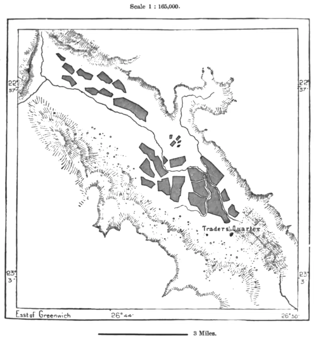 Shoshong, the Mangwato capital, is at present the largest town in South Africa beyond the British settlements. According to Holub and Mackenzie, it has had at times as many as thirty thousand inhabitants, exclusive of numerous villages usually grouped in a circle like the cattle enclosures, all really constituting part of the same urban population. But this gross aggregate has been considerably reduced by wars of succession, and had fallen in 1880 to little over six thousand. Since then, however, the population has again increased, thanks to the cessation of internecine strife. Lying 3,400 feet above sea-level in a vast plain, not, like most other Bechuana capitals, on a steep escarpment, Shoshong stretches along both sides of a mostly dry rivulet, which is dominated on the north by a granite ridge some 12 miles long. Southwards a basalt eminence is disposed parallel with