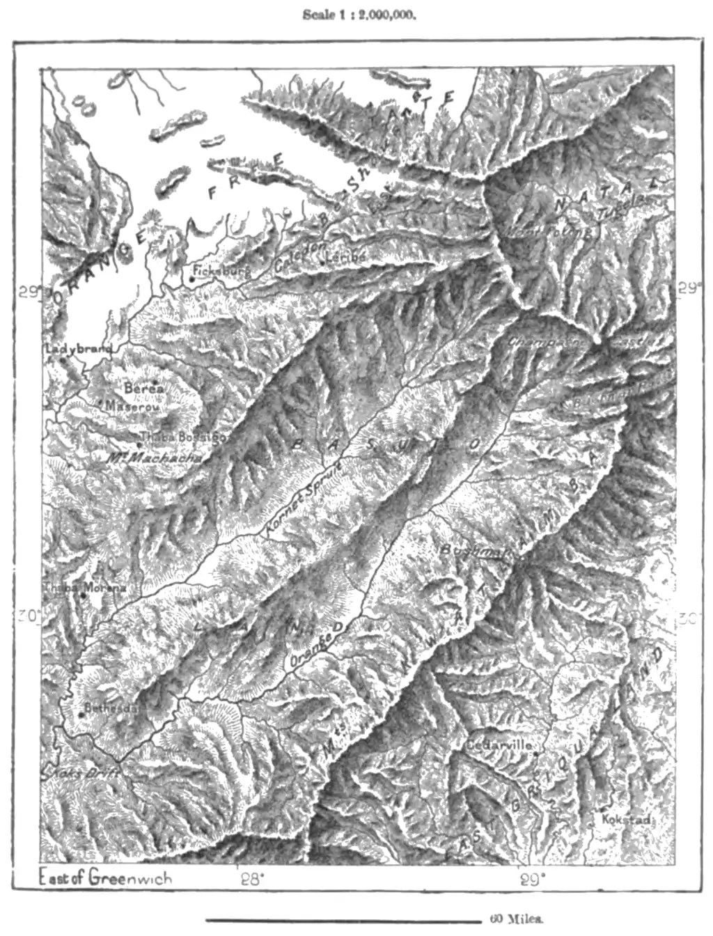 A conventional line drawn across the plateau from the right bank of the Orange to the left bank of the Vaal, henceforth detaches from the Free State and assigns to Cape Colony the triangular space comprised between the two rivers above their confluence. With a view to rounding off its frontiers, to this diamantiferous region has also been added a portion of the hilly tableland which stretches north of the Orange in the direction of the Kalahari Desert and of the new British Protectorate of Bechuanaland. Within its present limits the province of Griqualand West thus covers a superficial area of nearly eighteen thousand square