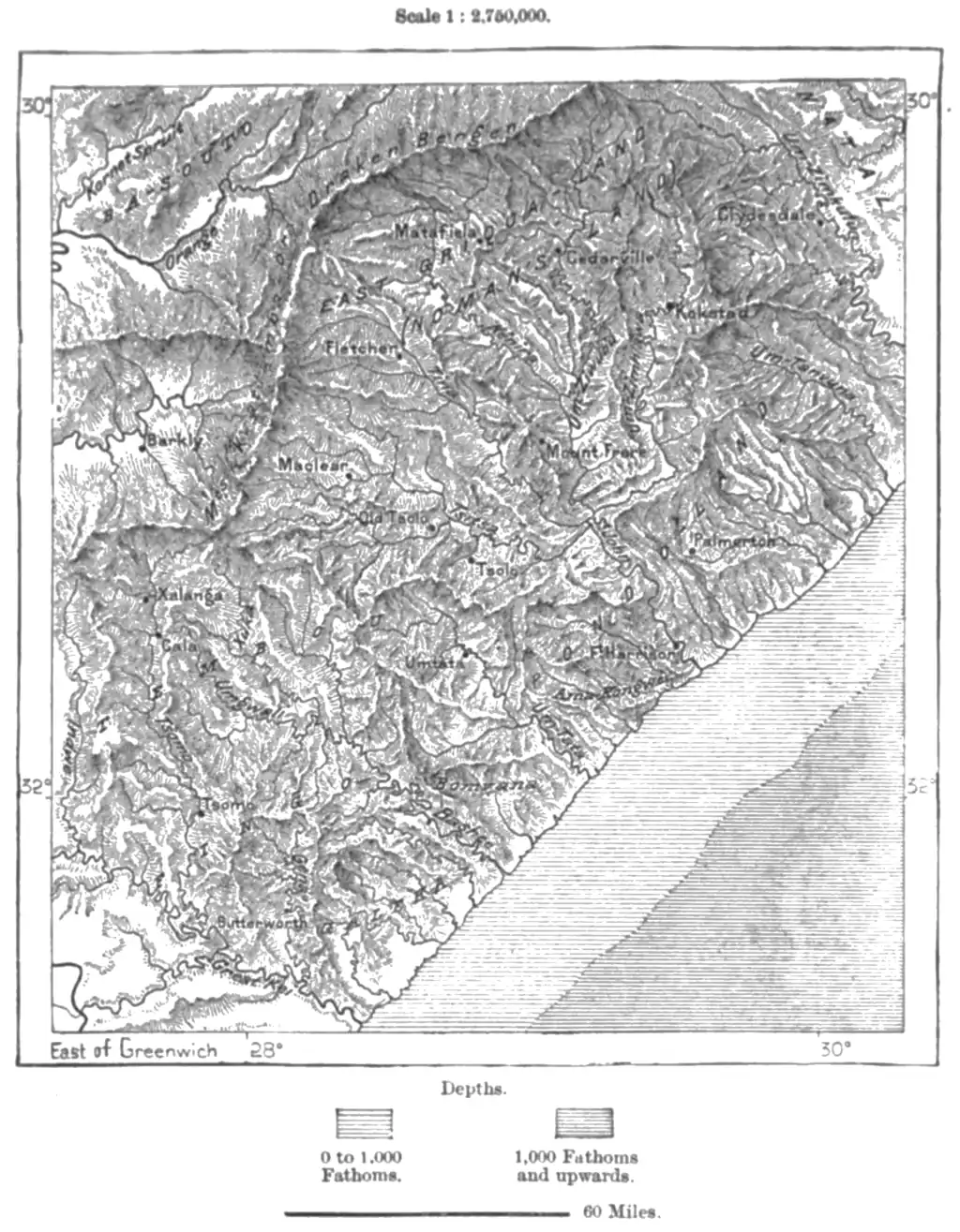 till the epoch of the ^rcat KngliHh immif^ition in 1H20, when it became the chief wntre of the operations in the KuHr wur«, often nerving an a place of refuge for the colonists settled on the eastern fnintior. Now it is no longer threatened by hostile natives, its barracks have been abandonetl by the military and adapted to the purposes of the civil administration, and the Kafirs of the neighbouHuxKl hnve be<'ome peaceful lulxmrers or industrious artisims. The white population of the town and surrounding district, of whom the great majority are of British descent, were formerly occupied chiefly with sheep-fanning IJut the region known as the Zuur-veld only produces a sour grass which is badly suited for sheep, and these have consequently in many districts been replaced bv ostriches. Here ostrich - farming and the preparation of the feathers for the European market have 8uccee<led better than in any other place where this industry has been establishe<l. Hitherto dependent on Port Elizabeth for its foreign trade, Graham's Town has recently endeavoured to secure an outlet for itiself. At the mouth of the little river Kowie, the nearest point on the coast, extensive works have been undertaken to get rid of the bar and establish convenient landing-stages and depots. Vessels drawing from 8 to 9 feet of water can already enter the estuary and discharge their cargoes at the quays of Purt Alfred, the new harbour, which is connected with Graham's Town by a railway running through the agricultural town of Jiat/mrxf. The neighbouring beach is much fretjuented in summer as a favourite watering-place. The promontory visible to the west, and bounding the east side of Algoa Bay, bears the name of Point Padrone, doubtless because here the Portuguese formerly raised a padrao, or memorial stone, as on so many other headlands along this seaboard. Near Cape Padrone lies the modem village of Altxandn'a. The basin of the Great Fish River, which winds to the east of the Graham's Town heights, has its farther sources on the southern slope of the main northern range, near the southernmost point reached by the Orange River, and is divided into several electoral districts. Middlehurg, on an upper affluent of the river, lies already on the incline by which the Port- Elizabeth railway creeps up the escarp- ment in order to cross the range into the Orange basin through the Bosworth Pass, which stands at a height of 5,200 feet, greater than that of many an Alpine railway. Cradock, on the main stream itself, and Tmha-stad, on one of it« tributaries, are important centres of the colonial wool trade. In the neighbouring distiict still survive in the wild state a few groups of quiggas, which are now protected by the game laws. Somerxet and licdjord are also agricultural centres, while Fort lieanfort has preserved something of its original military aspect. As an advanced outpost towards the Kafir country, it bravely withstood the repeated assaults of the hostile natives in IHOl. The district which stretches northwards along th.' southern slope of the Elandsberg and now called Stotkenstrom, was formerly known as the Kat River Colony, which Ix'fore the war of IHol had been exclusively reserved for the Hottentots. But the land being fertile and well watered by the Kat River, the whites soon found the usual pretexts for occupying it, and the 186 SOUTH AND EAST AFRICA. little town of Seymour has alreaJy been founded by the English settlers in the centre of the old Hottentot Reserve. Farther south Lovedule, centre of schools and missions, and Alice, east of Fort Beaufort, lie both in the valley of the Keis- kiimnia. Fui't Peddle, un old military station nearer to the coast, has become the chief centre of population in the " neutral zone," which was formerly limited on one side by the Great Fish River, on the other by the Keiskamma. Farther east the border lands still more recently contested by the Kafirs and the English squatters are now pacified, and have also their white settlements. The capital of this conquered territory is King Wiliiam's Town, more commonly designated by the simple name of King. Of late years it has become a great trading centre, and the chief depot for the traffic between the British colonists and the Kafirs, Nearly all the farmsteads dotted along the banks of the river in this district are inhabited by Germans, descendants of the Anglo Germanic Legion which was disbanded after the Crimean war. Hence such names as Berlin^ Potsdam, Braunschweig, Frankfurt, given to the recent settlements in this part of the country. Like Graham's Town, King has also sought for an independent outlet for its trade, and it is now connected by a railway with Fast London, one of the most dangerous seaports on this coast. Jetties, quays, and breakwaters have been constructed, and extensive works carried out to deepen and shelter the estuary ; but all in vain, and the harbour often remains inaccessible for days together. The Buffalo River, which reaches the sea at this point, has occasionally swept away the bar during some sudden freshet, and then vessels drawing 20 feet of water could enter the port, but now the bar is fixed, and has seldom a depth of more than 8 or 9 feet at the flow. In South Africa the remark has become proverbial that East London is one of those ports which are highly in favour with owners who want to lose their ships, crew and all, in order to recover the insurance on the freight from the underwriters. Yet in spite of everything, East London is the second port in the colony for the shipment of wool, of which nearly eighteen million pounds were forwarded in 188G. Like the large towns in the western district. King William's Town is connected with the Orange ba-in by a railway, which surmounts the Storm-berg at a pass nearly 5,700 feet high. The line passes through Stutterheim, Cat heart, and Queens- town, in the well-watered district which formerly belonged to the Tambuki Kafirs. It then turns the pyramidal m