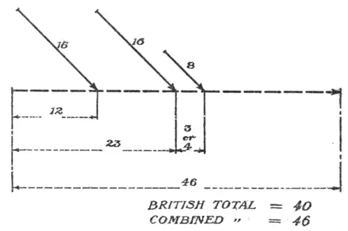 Thus we are led to appreciate the commanding importance of a correct tactical scheme. If in the actual battle the old-time method of attack had been adopted, it is extremely doubtful whether the superior seamanship and gunnery of the British could have averted defeat. The actual forces on the day were 27 British sail of the line against the combined fleet numbering 33, a rather less favourable ratio than assumed in the Memorandum. In the battle, as it took place, the British attacked in two columns instead of three, as laid down in the Memorandum; but the scheme of concentration followed the original idea. The fact that the wind was of the lightest was alone sufficient to determine the exclusion of the enemy's van from the action. However, as a study the Memorandum is far more important than the actual event, and in the foregoing analysis it is truly remarkable to find, firstly, the definite statement of the cutting the enemy into two equal parts—according to the n-square law the exact proportion corresponding to the reduction of his total effective strength to a minimum; and, secondly, the selection of a proportion, the nearest whole-number equivalent to the √2 ratio of theory, required to give a fighting strength equal to tackling the two halves of the enemy on level terms, and the detachment of the remainder, the column of eight sail, to weaken and impede the leading half of the enemy's fleet to guarantee the success of the main idea. If, as might fairly be assumed, the foregoing is more than a coincidence,[10] it suggests itself that Nelson, if not actually acquainted with the n-square law, must have had some equivalent basis on which to figure his tactical values.