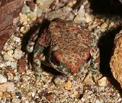 Canyon TreefrogThis frog is plump and warty, with a toad like appearance. It has olive to brownish-grey skin with darker blotches present in most populations. A very distinctive feature of this frog is what appears like suction discs on each toe. Primarily nocturnal; often seen along water course. During the day it can be found hiding among rocks or in stony crevices near streams, camouflaged by its color. |
