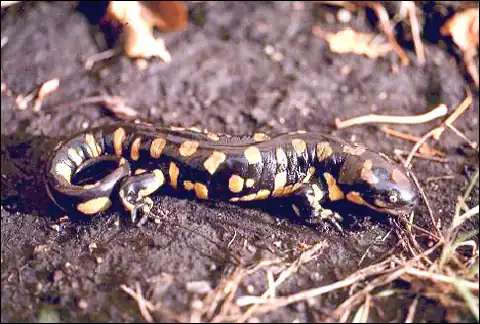 Tiger SalamanderThis is the world’s largest land-dwelling salamander. It is stoutly built, with a broad head and small eyes. Color and pattern extremely variable-large light spots, bars, or blotches on dark background or network of spots on lighter background. There are tubercles on soles of the feet. Often seen at night after heavy rains, especially during breeding season; they live beneath debris near water or in crayfish or mammal burrows. They are voracious consumers of earthworms, large insects, small mice, and amphibians |