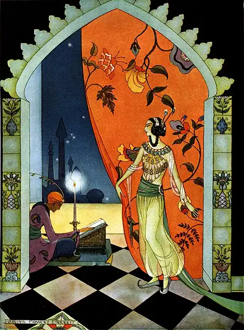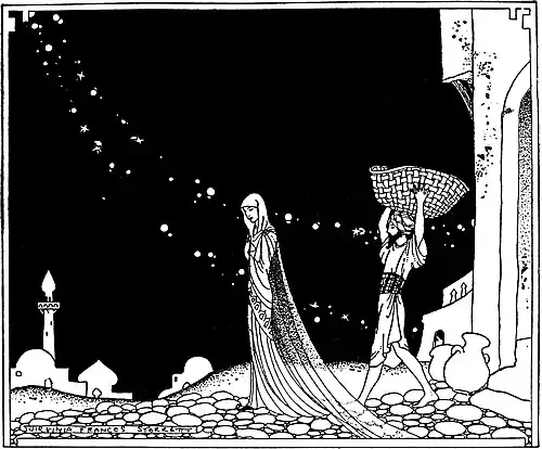 “I had hoped,” said Scheherazade, “to tell your majesty the astonishing story of the wonderful lamp of Aladdin, but I perceive that it is so near day that there will not be opportunity. Although the story which I have just brought to so happy an ending is full of surprises and enchantments, yet this one, too, has some singular incidents—”