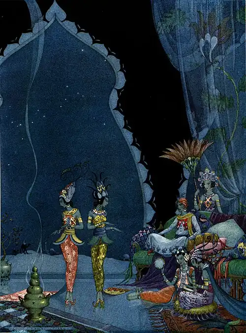 “The king, my father, had chosen for my husband a prince, who was my cousin; but on the very night of the bridal festivities, in the midst of the rejoicings of the court, a genie took me away. I fainted with alarm, and when I recovered I found myself in this place. I was long inconsolable; but time and necessity have reconciled me. Twenty-five years I have passed in this place, in which I have everything necessary for life and splendor.
