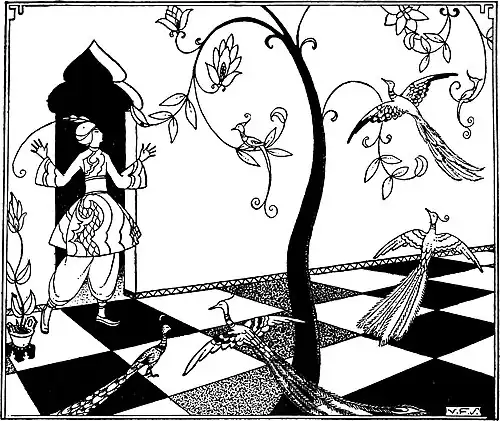 I opened the third door, and found a large aviary, paved with marble of several fine and uncommon colors. The trelliswork was made of sandalwood and wood of aloes. It contained a vast number of nightingales, goldfinches, canary-birds, larks, and other singing birds, and the vessels that held their seed were of the most sparkling jasper or agate. The sun went down, and I retired, charmed with the notes of the multitude of birds, who then began to perch upon such places as suited them for repose during the night. I went to my chamber, resolving on the following days to open all the rest of the doors, excepting that of gold.