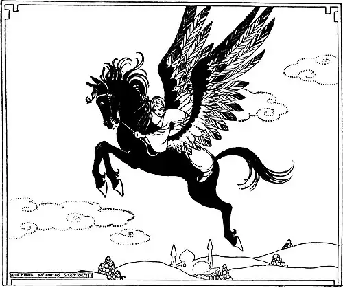 Among the many objects that attracted my attention was a black horse, of the most perfect symmetry and beauty. I approached in order the better to observe him, and found he had on a saddle and bridle of massive gold, curiously wrought. One part of his manger was filled with clean barley, and the other with rose water. I laid hold of his bridle, and led him out to view him by daylight. I mounted, and endeavored to make him move; but finding he did not stir, I struck him with a switch I had taken up in his magnificent stable. He had no sooner felt the whip, than he began to neigh in a most horrible manner, and extending wings,