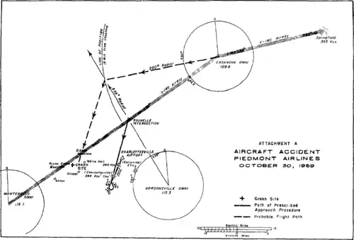 The flight made a Georgetown departure and then proceeded to the Springfield, Virginia, radio beacon where it entered V-140 airway. It followed the airway from Springfield to the Casanova omni range station. The centerline of the airway over this segment is defined as the 260-degree radial of the Casanova omni. At 2012[3] Flight 349 reported that it was over Casanova at 2010. It also reported it was at 4,000 feet and estimating the Rochelle intersection at 2024, with Charlottesville next.