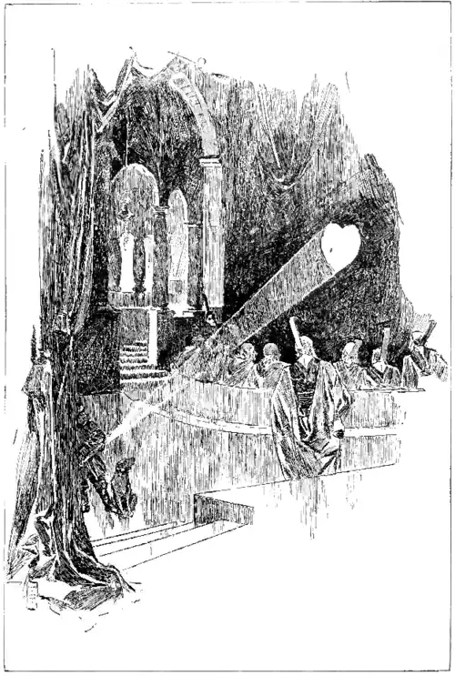 One part of the city of the Transparent Folk which attracted Bulger and me very much was the royal gardens. It was a weird and uncanny place, and upon my first visit I walked through its paths and beneath its arbors upon my toes and with bated breath, as you might steal into some bit of fairy-land, looking anxiously from side to side as if at every step you expected some sprite or goblin to trip you up with a tough spider-web, or brush your cheeks with their cold and satiny wings.