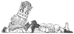 NOW it happened one morning as Bill was shepherding his little flock across the downs, whither they loved to ramble on a fine summer's day, that Hannibal, Quentin, and Boadicea came running up to him with the wonderful tidings that they had discovered a real golden crown lying on the top of a hayrick. Bill hastened to the spot, and there, sure enough, was a most beautiful crown, ornamented with what he took to be priceless gems. Looking all round and seeing no one to whom it might belong, he climbed the rick and attempted to remove the treasure. But, try as he would, it still resisted his efforts, until at last, with one mighty wrench, he seemed to elicit a groan from the depths of the rick, and presently the crown arose apparently of its own accord and disclosed the head of an aged man firmly fixed therein. Soon his neck, then his shoulders appeared, as gradually the old fellow lifted himself from his place of hiding and climbed down the sides of the rick and stood trembling in the midst of the children, who now wonderingly gathered round him.