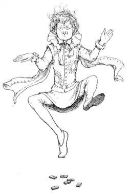 'At length the clock in the hall downstairs struck eleven, and as the last beat echoed through the empty rooms, a light appeared underneath the door opposite the throne. Little heed did I give to this at first, imagining that one of the ministers, on retiring, had omitted to remove his boots and leave them in the hall, and was now returning to place them there. The light, however, remained, and to my increasing wonderment some one tried the handle of the door, which was then opened very cautiously and in there crept, on hands and knees, my old friend the Prime Minister. As soon as he was well within the room and had quietly closed the door, he leapt to his feet and executed the most astonishing capers that were ever danced. With the liveliest satisfaction expressed all over his mobile features, he pirouetted round the room with the greatest animation, and daringly accomplished the giddiest somersaults that were ever turned. At last, nearly exhausted with this vigorous performance, he ran up to the throne, grasped me by the hand, which he wrung most heartily, and for all the world was his good old self again.