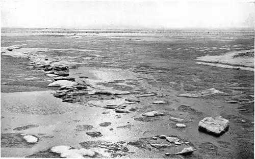 The sand itself was firm as a macadam road and far more slippery, for the receding, shallowing waves froze as they slipped seaward, and the wet surface became a film of ice. Ice, too, had filled the tiny valleys between the iron-hard ridges of the ripple marks, and all along the highest tide line was a broad ice border, inches deep and several yards in width. The flowing tide had stripped the ice film from the shore, pushing it forward, piling layer upon layer; film had frozen to film, forming a cake; cake upon cake had made an ice-floe. Crushed and up-ended, this mass had been forced landward by the resistless power behind until the shore resembled an Arctic scene.