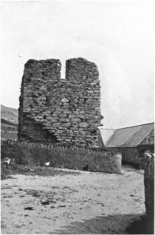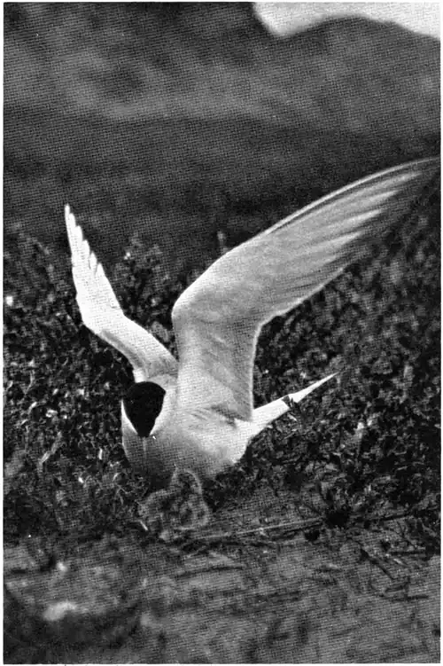 We sat amongst the ruins watching the children from the cottages playing in a hollow below. Beyond the four white cottages is a small harbour, where at one time there was a lifeboat and where the pilot boats can be hauled up the sandy beach. On a headland is a tower, used as a landmark before the lighthouse was erected, and beyond the lighthouse, on a couple of stacks, hundreds of terns lay their nests on the bare, jagged rocks or amongst the dense tangle of tree-mallow and sea-beet. Drying their wings on a tangle-covered stack were three or four cormorants, heraldic birds holding their black pinions half unfurled; nearer an orange-billed oystercatcher eyed us suspiciously. Beyond, a wide sweep of firm sand stretched to Aber Menai, once a ferry to Carnarvon, and behind were the billowy dunes, their loose tops lifted like smoke in the stiff sea-breeze. Across the streak of twinkling water, looking cool under a hot sun, lay the Welsh shore with its stern background of mountains, the Snowdon range. Far away to the right, beneath the peaks of Yr Eifl, was the precipitous face of Careg-y-llam, haunt of the chough in those days, and where the guillemots still line the ledges in thousands. Towering above was the shaggy top of Carn Madryn, beyond the Rivals, and to the north Carnedd-goch, scarred by the Nantlle quarries; the snow-capped conical peak of Snowdon itself and the sister height of Crib-y-dysgyll, a great snow mound, were straight before us. The Glydyrs and Carnedds were white alps, Y Foel Fras had a wintry cap; we might have been gazing on Alps, dazzlingly white in hot summer sunshine.