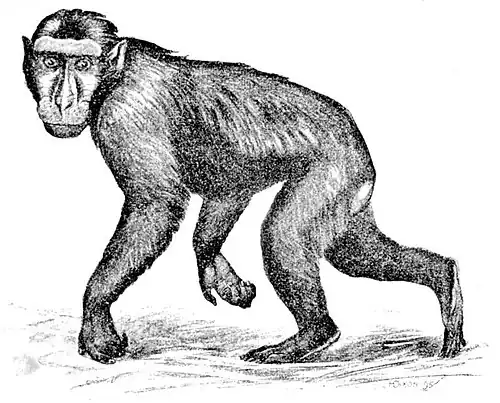 Fossil Monkeys.—Several of the existing genera of Old-World Apes are also known to have existed in past times; in some cases their past distribution indicates a greater range. Thus Macacus is now represented—and that doubtfully—in Europe by the Barbary Ape alone. But from Montpellier have been unearthed the remains of M. priscus, from Pliocene beds. The Asiatic Semnopithecus is known to have lived during the Pliocene period; its remains are discovered in France and Italy, as well as in Asia. In addition to these existing forms, a number of totally extinct Old-World genera are known. The rich formation at Pikermi near Athens has produced Mesopithecus pentelici; this Monkey has a skull which recalls that of Semnopithecus, while the stout limbs are rather Macaque-like. As is the case with many living Catarrhines, the males have stronger canines. The animal had a long tail.