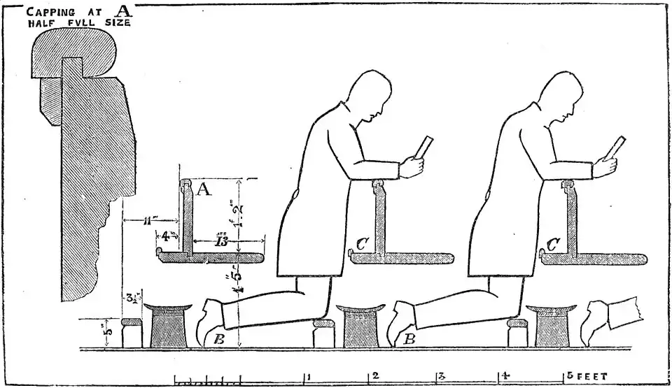 "Full-sized Models of the Seats and Kneeling-boards, as illustrated at the end of this paper, can now be seen at the Offices of the Incorporated Church Building Society, No. 2, Dean's Yard, Westminster, on application to the Secretary, during office hours.