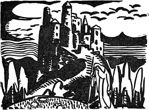 He jumped up and started eagerly off in the direction the ravens had taken. As he left a valley and climbed a little hill he saw before him a beautiful wide meadow in the midst of which stood the Golden Castle shining like the sun. Before the gate of the castle stood a bent old Yezibaba leaning on a golden staff.