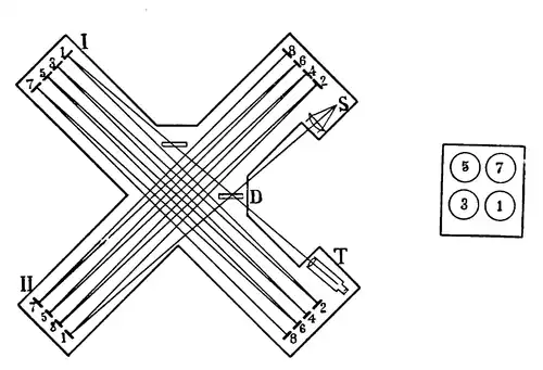 Figure 1 is a diagram, not to scale, of the optical arrangements. Light from a source S reaches the mirror D. Part is transmitted, reaching the mirror II. It is successively reflected to 2, 3, 4, 5, 6, 7, and 8. From 8 it returns by the same path to D, where part is reflected to the observer at T. Another part of the incident ray is reflected along the other arm of the cross, is similarly passed to and fro, returned, and at last transmitted to the observer. In the apparatus actually used, mirror 5 lay above 3, rather than to one side of it; Figure 2 shows this arrangement. The whole path of the light along these mirrors was enclosed and covered, to lessen the effect of air currents and other local disturbances. An acetylene flame was carried as a source of light. A telescope magnifying thirty-five diameters gave distinct vision of mirror 8, at whose surface the interference fringes are apparently localized.