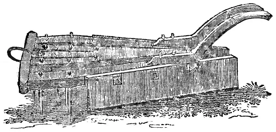 The model, from which this cut has been executed, is on the scale of two inches to one foot; so that the head of the harrow is three feet wide from one side of the bar to the other, externally. These bars are four inches square; five feet long; and, to prevent them from being split, they are contrived lengthwise, instead of being in a transverse direction. The mould-boards are four feet two inches in length, ten inches in depth, and two in thickness: they extend 11 inches beyond the bars, in order that the stones (which are brought to the surface by the teeth of the harrow) may be drawn into a smaller compass. These mould-boards are, farther, shod with an iron-bar, and lined with a plate of the same metal, to the height of the spot where they are marked black, in the cut above annexed; and such parts of this delineation, as are represented of a deeper colour, distinguish the iron from the wood-work. The teeth are one foot in length from the inferior side of the bars to their points, which ought to be steeled: they are 1+1/4 inch square, and are fixed by means of strong nuts and screws, with collars both on the upper and lower side of such bars.