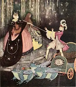 The Prince took a carriage drawn by three great frogs