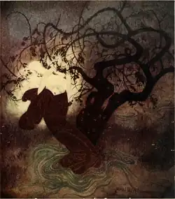 Guided by the light that streamed from her feet, she advanced into the bog. As the summer wind stirs one tussock after another, so she stepped onward between the slimy ponds and deadly quagmires. Now she reached a jet-black pool, and all too late she saw the stars shining in its depths. Her foot tripped and all she could do was to snatch at an overhanging branch of a snag as she fell forward. To this she clung, but, fast as she gripped it, faster still some tendrils from the bough whipped round her wrists like manacles and held her there a prisoner. She struggled and wrenched and tugged with all her might and main, but the tendrils only tightened and cut into her wrists like steel bands.