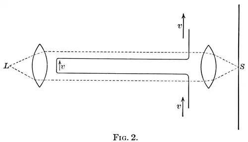 But the theory of Hertz has led to various contradictions with experience. I will refer here to the most important of these. Fizeau brought (1851) into parallelism a bundle of rays originating in a light source by means of a lens and then brought it to a focus by means of a second lens upon a screen (Fig. 2). In the path of the parallel light rays between the two lenses he placed a tube system of such sort that a transparent liquid could be passed through it, and in such manner that in one half (the upper) the light rays would pass in the direction of flow of the liquid while in the other half (the lower), the rays would pass in the opposite direction.