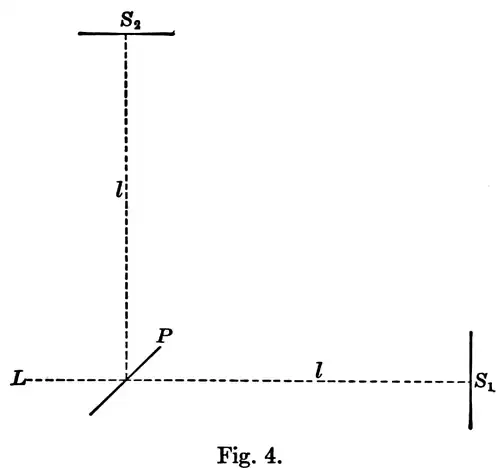 This elementary consideration led to the celebrated attempt of Michelson to measure the motion of the earth relative to the ether. A parallel beam of rays proceeding from (Fig. 4) falls upon a transparent plane parallel plate inclined at , by which it is in part transmitted and in part reflected. The transmitted and reflected beams are brought into interference by reflection from suitable metallic mirrors and , which are removed by the same distance from . If, now, the earth with the whole apparatus moves in the direction with the velocity , then the time which the light needs in order to go from to and back is:
