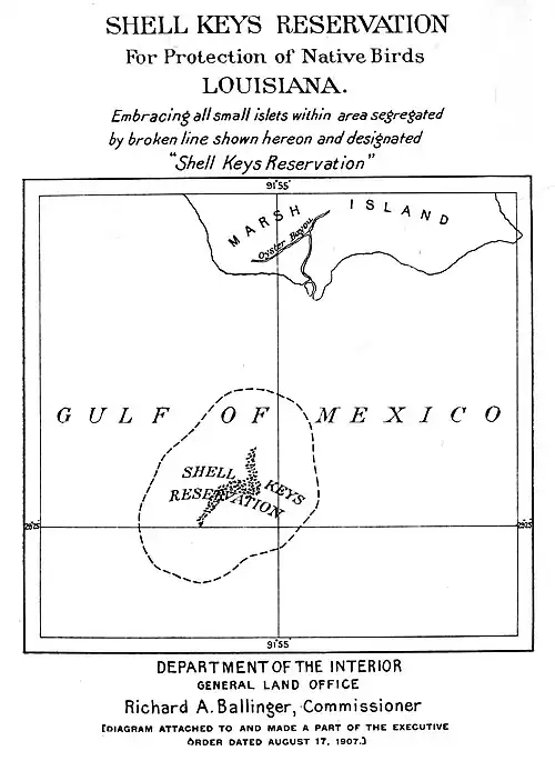 It is hereby ordered that the Executive Order of July 9, 1855, creating the Light House Reservation, which embraces a small group of unsurveyed islets located in the Gulf of Mexico about three and one-half miles south of Marsh Island, Louisiana, and approximately in latitude 29° 26′ north, longitude 91° 51′ west from Greenwich, as appears upon United States Coast Survey Chart No. 200, be, and the same is hereby vacated and set aside; and it is also ordered that these islets, located within the area segregated and shown upon the diagram hereto attached and made a part of this Order, be, and they are hereby reserved and set apart for the use of the Department of Agriculture as a reserve and breeding ground for native birds. This reservation to be known as Shell Keys Reservation.