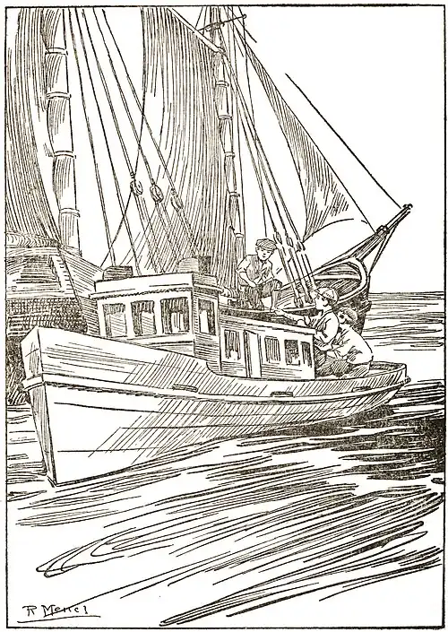 A little breeze had sprung up, and, now that the sails of the schooner were set to catch the wind, she went ahead through the waves, pulling the motor boat after her.