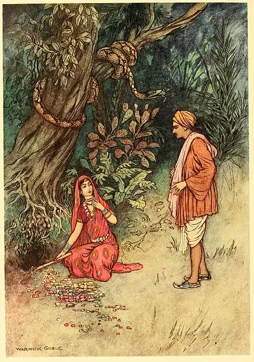 "Once on a time there lived a goldsmith who had a grown-up son. And this son had a wife who had the rare faculty of understanding the language of beasts; but neither her husband nor any one else knew that she had this uncommon gift. One night she was lying in bed beside her husband in their house, which was close to a river, when she heard a jackal howl out, 'There goes a carcase floating on the river; is there any one who will take off the diamond ring from the finger of the dead man and give me the corpse to eat?' The woman understood the jackal's language, got up from bed and went to the river-side. The husband, who was not asleep, followed his wife at some distance so as not to be observed by her. The woman went into the water, tugged the floating corpse towards the shore, and saw the diamond ring on the finger. Unable to loosen it with her hand, as the fingers of the dead body had swelled, she bit it off with her teeth, and put the dead body upon land. She then went to her bed, whither she had been preceded by her husband. The young goldsmith lay beside his wife almost petrified with fear, for he concluded after what he saw that his wife was not a human being but a Rakshasi. He spent the rest of the night in tossing in his bed, and early in the morning spoke to his father in the following manner: 'Father, the woman whom thou hast given me to wife is not a real woman but a Rakshasi. Last night as I was lying in bed with her, I heard outside the house, towards the river-side, a jackal set up a fearful howl. On this she, thinking that I was asleep, got up from bed, opened the door, and went out to the river-side. Surprised to see her go out alone at the dead hour of night, I suspected evil and followed her, but so that she could not see me. What did she do, do you think? O horror of horrors! She went into the stream, dragged towards the shore the dead body of a man which was floating by, and began to eat it! I saw this with mine own eyes. I then returned home while she was feasting upon the carcase, and jumped into bed. In a few minutes she also returned, bolted the door, and lay beside me. O my father, how can I live with a Rakshasi? She will certainly kill me and eat me up one night.' The old goldsmith was not a little shocked to hear this account. Both father and son agreed that the woman should be taken into the forest and there left to be devoured by wild beasts. Accordingly the young goldsmith spoke to his wife thus: 'My dear love, you had better not cook much this morning; only boil rice and burn a brinjal, for I must take you to-day to see your father and mother, who are dying to see you.' At the mention of her father's house she became full of joy, and finished the cooking in no time. The husband and wife snatched a hasty breakfast and started on their journey. The way lay through a dense jungle, in which the goldsmith bethought himself of leaving his wife alone to be eaten up by wild beasts. But while they