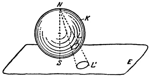 diametrically opposite to S, there is a luminous point, throwing a shadow L' of the disc L upon the plane E. Every point on the sphere has its shadow on the plane. If the disc on the sphere K is moved, its shadow L' on the plane E also moves. When the disc L is at S, it almost exactly coincides with its shadow. If it moves on the spherical surface away from S upwards, the disc shadow L' on the plane also moves away from S on the plane outwards, growing bigger and bigger. As the disc L approaches the luminous point N, the shadow moves off to infinity, and becomes infinitely great.