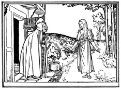 Once upon a time there was a widow who had two daughters; one of them was beautiful and industrious, the other ugly and lazy. The mother, however, loved the ugly and lazy one best, because she was her own daughter, and so the other, who was only her step-daughter, was made to do all the work of the house, and was quite the Cinderella of the family. Her step-mother sent her out every day to sit by the well in the high-road, there to spin until she made her fingers bleed. Now it chanced one day that some blood fell on to the spindle, and as the girl stooped over the well to wash it off, the spindle suddenly sprang out of her hand and fell into the water. She ran home crying to tell of her misfortune, but her stepmother spoke harshly to her, and after giving her a violent scolding, said unkindly, "As you have let the spindle fall into the well you may go yourself and fetch it out."