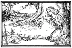 One fine evening a young princess put on her bonnet and clogs, and went out to take a walk by herself in a wood; and when she came to a cool spring of water, that rose in the midst of it, she sat herself down to rest awhile. Now she had a golden ball in her hand, which was her favourite plaything; and she was always tossing it up into the air, and catching it again as it fell. After a time she threw it up so high that she missed catching it as it fell; and the ball bounded away, and rolled along upon the ground, till at last it fell down into the spring. The princess looked into the spring after her ball, but it was very deep, so deep that she could not see the bottom of it. Then she began to bewail her loss, and said, "Alas! if I could only get my ball again, I would give all my fine clothes and jewels, and everything that I have in the world."